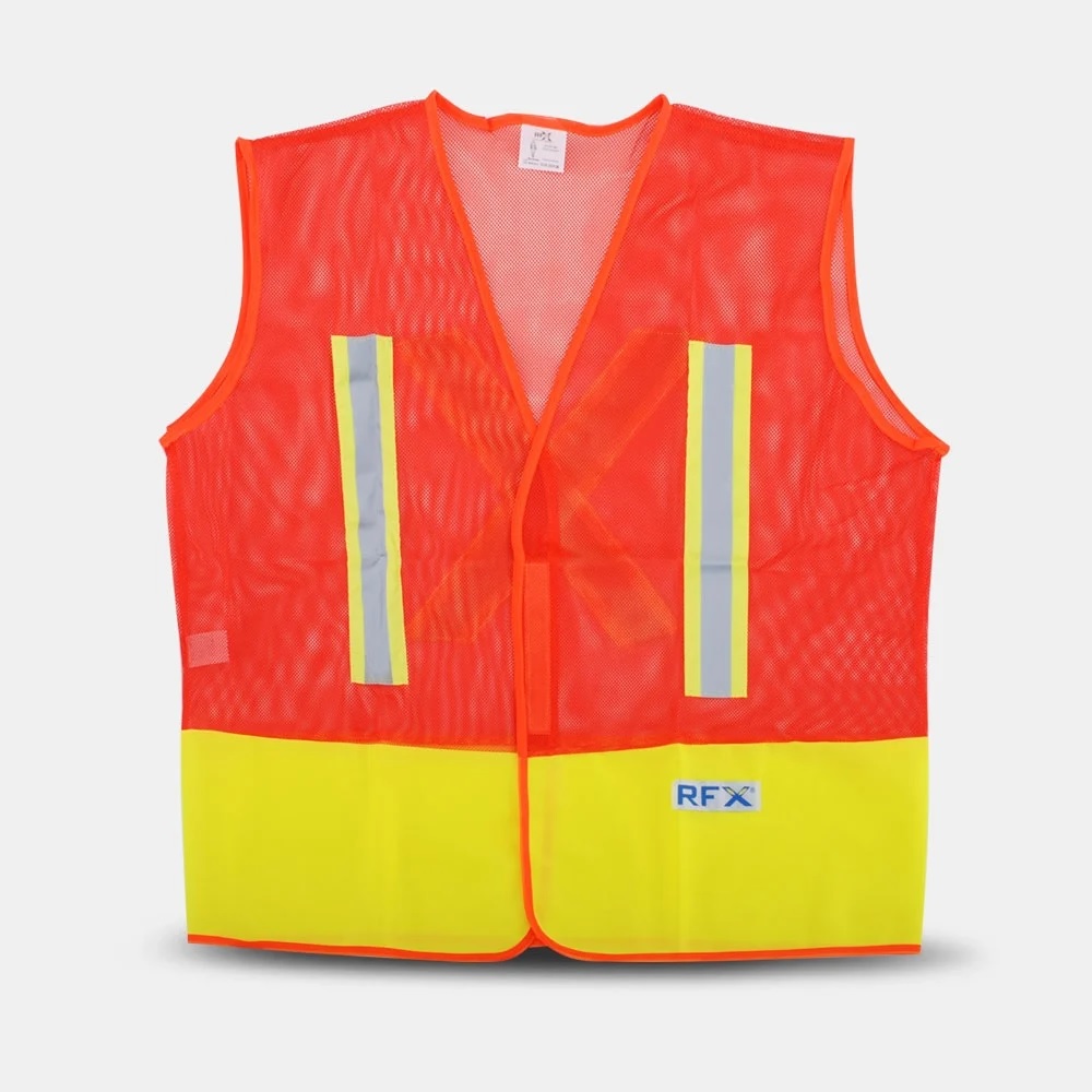 Colete de sinalização de alta visibilidade, confeccionado em tecido fluorescente 100% poliéster, combinado com faixas retrorrefletivas repelentes de água em X nas costas, paralelas na parte frontal e fechamento frontal em velcro.